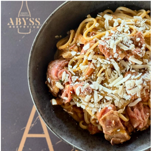με λιγκουίνι βουτύρου, καπνιστό σε φασκόμηλο σύγκλινο Μάνης, τηγανητό αυγό & ξερή μυζήθρα Κρήτης
