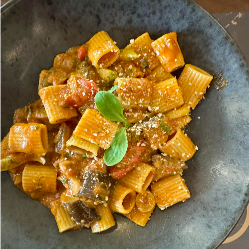 με μεσογειακή σάλτσα τομάτας, κολοκυθάκι, πράσινες ελιές & κράμπλ μυρωδικών