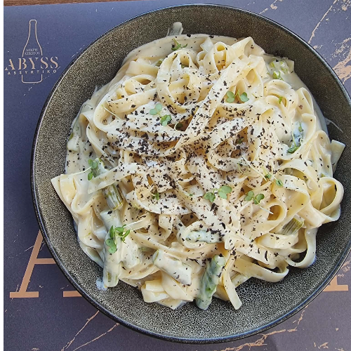 σε λευκή λεμονάτη σάλτσα με χρένο, αρακά, σπαράγγια & πέστο μυρωδικών
