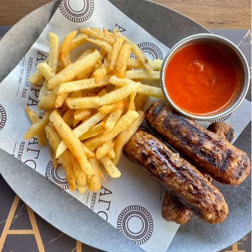 μαριναρισμένο σε αρωματικά βότανα, ψητό στα κάρβουνα με φρέσκιες πατάτες τηγανητές σε κρούστα μπαχαρικών & πικάντικη μαγιονέζα με μέλι και μουστάρδα